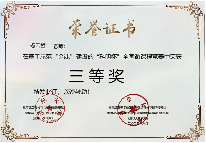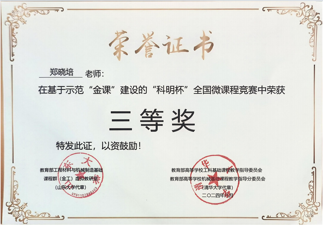 2024年8月30日,基于示范“金课 ”建设的全国微课程竞赛获奖名单正式 公布,我校工程训练中心郑晓培、杨云哲两位老师分别荣获 2024 年全国基于示 范“金课 ”建设的全国微课程竞赛国赛三等奖。