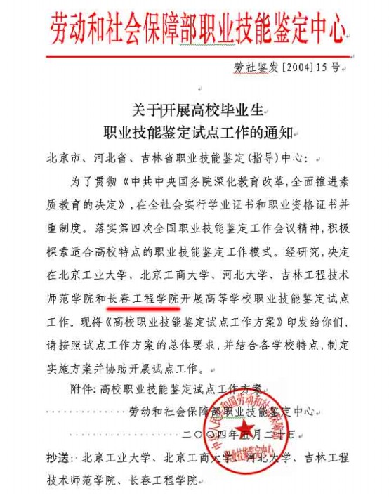 工程训练中心曾被吉林省劳动厅和社会保障厅、教育厅确定为省职业技能鉴定的定点单位。经过不断的建设和发展,2004年被国家劳动和社会保障部指定为职业技能鉴定试点单位,2007年被吉林省劳动和社会保障厅评定为省级职业技能公共实训基地。